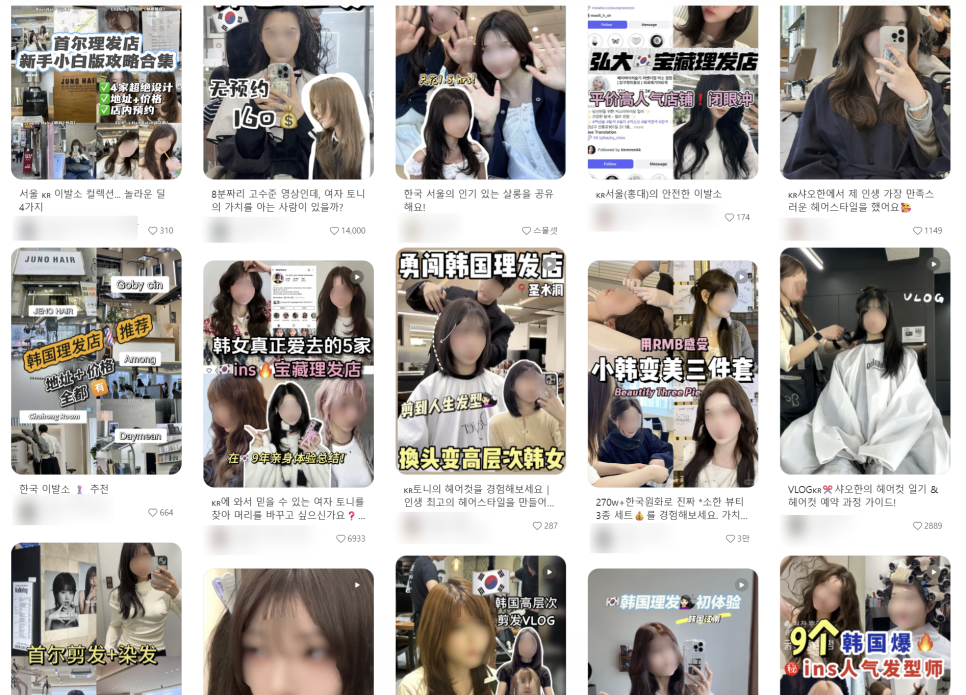 ▼ 중국 SNS 샤오홍슈, '한국 미용실 방문 후기'를 검색했을 때 나오는 다양한 SNS 글들