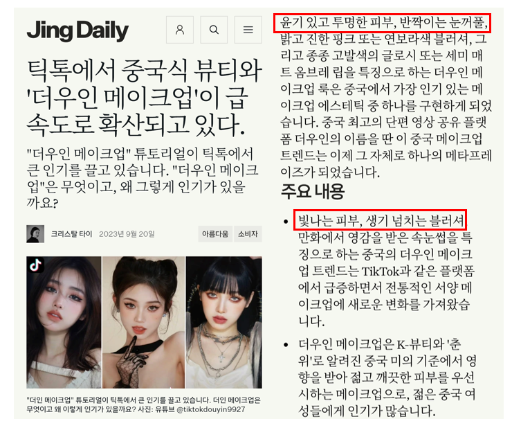 출처: Jing Daily, “The viral rise of Chinese-style beauty and ‘Douyin makeup’ on TikTok”, 2023.
